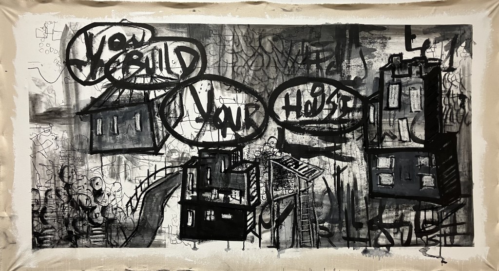 Char coal, Ink and Acrylic on canvas. App. 70×50″
